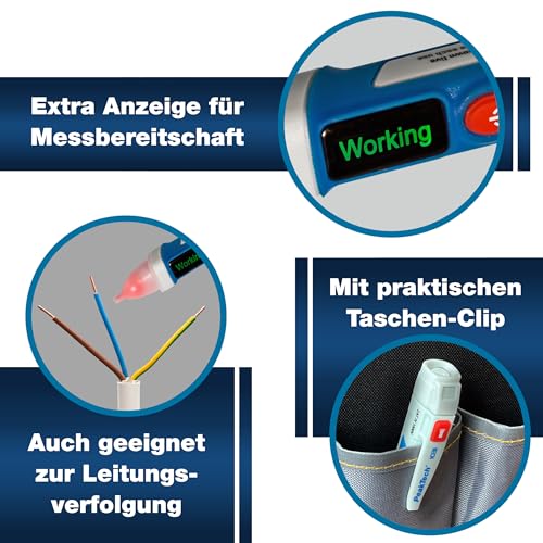 Wenn der P 1031 Wechselspannung am Messpunkt erkennt, gibt er dir gleich mehrere Signale: Eine integrierte LED blinkt rot, zusätzlich ertönt ein akustischer Signalton und ein Vibrationsalarm wird ausgelöst. So kannst du dir sicher sein, dass du die Warnung nicht übersiehst. Das Gerät ist benutzerfreundlich und leicht zu bedienen. Dank seiner handlichen Größe und des praktischen Taschenclips passt er problemlos in jede Hemdtasche und ist immer einsatzbereit.