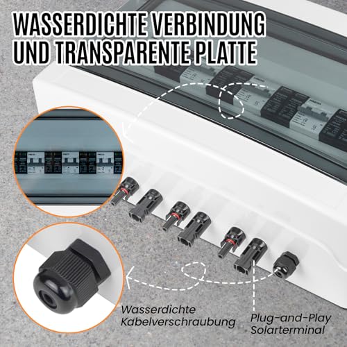 Die Installation gestaltet sich dank des Plug-and-Play-Designs besonders einfach. Im Lieferumfang sind vorgefertigte Solarkabel, MC4-Stecker, Montagehalterungen und Dichtungen enthalten. Durch das transparente Sichtfenster kannst du die LS-Schalter und SPD-Indikatoren jederzeit überprüfen, ohne das Gehäuse öffnen zu müssen. Dies ist besonders praktisch bei schlechtem Wetter.