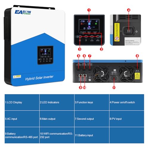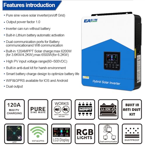 Produktbeschreibung: POWLAND 6200W Hybrid Wechselrichter 48Vdc zu AC 230V mit WiFi Modul 2 AC-Ausgang Breite PV 60-500VDC Off Grid Reine Sinus Welle Solar Wechselrichter 120A MPPT Für Bleisäure- und Lithium-Batterien