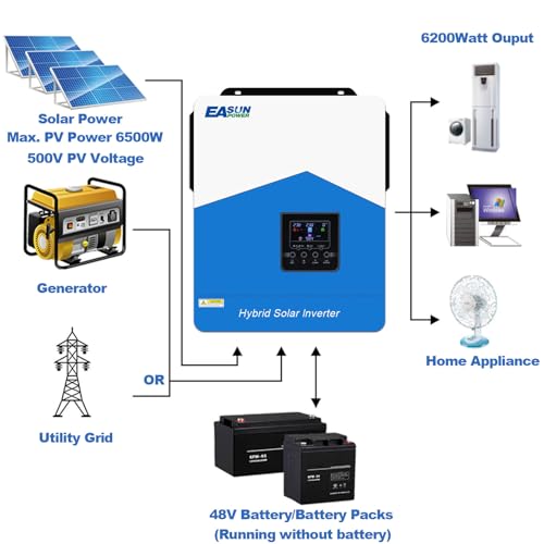 Im Vergleich zu anderen Hybrid-Wechselrichtern zeichnet sich der POWLAND 6200W durch seine breite PV-Eingangsspannung aus, die eine flexible Anpassung an verschiedene Solaranlagen ermöglicht. Das integrierte WiFi-Modul zur Fernüberwachung ist ebenfalls ein Vorteil gegenüber Modellen, die diese Funktion nicht bieten. Einige andere Wechselrichter bieten möglicherweise eine Parallelfunktion, die beim POWLAND 6200W nicht vorhanden ist. Die reinen Sinuswellen-Ausgabe ist ein wichtiger Aspekt, um die Kompatibilität mit empfindlichen elektronischen Geräten sicherzustellen, was nicht bei allen Wechselrichtern Standard ist.