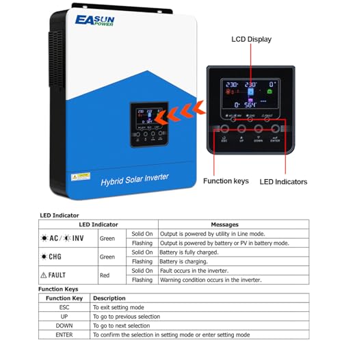 Dieser Wechselrichter zeichnet sich durch seine breite PV-Eingangsspannung von 60-500VDC aus. Die optimale PV-Spannung liegt laut Beschreibung bei 360V. Der integrierte MPPT-Laderegler sorgt für eine effiziente Ladung deiner Batterien mit einem maximalen Ladestrom von 120A. Außerdem verfügt der Wechselrichter über zwei AC-Ausgänge, wobei der Primärausgang bei niedriger Batteriespannung abgeschaltet wird, um Energie zu sparen. Diese Funktion kann bei Bedarf aktiviert werden.