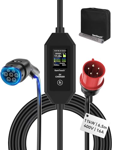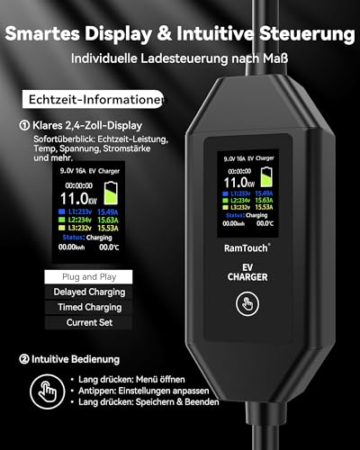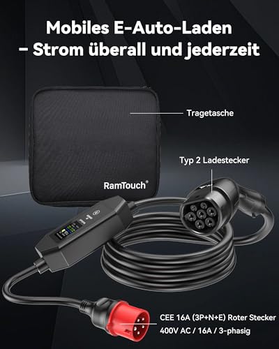 Produktbeschreibung: RamTouch Mobile Wallbox 11 kW (6,5 m, 3-phasig, Ladekabel CEE 16 A auf Typ 2) – Mobile Ladestation (6A–16A einstellbar), Lade-Timer & Verzögerung, Für alle Elektroautos (EV) & Plug-in-Hybride (PHEV)