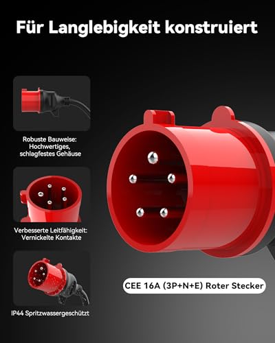 - Robuster, roter 5-poliger 16A 400V CEE-Stecker nach IEC-Norm 60309