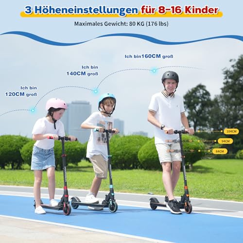 Besonders praktisch ist, dass der Roller faltbar ist. Mit wenigen Handgriffen lässt er sich zusammenklappen und einfach transportieren oder verstauen. Der verbesserte Roller verfügt über einen abnehmbaren Lenker und wiegt nur 7,55 kg. Die Maße im gefalteten Zustand betragen 81,5*43*25,5 cm. Der Lenker ist höhenverstellbar (84 cm bis 104 cm), sodass du den Roller optimal an deine Körpergröße anpassen kannst. Geeignet ist der E-Scooter für Kinder und Jugendliche mit einer Körpergröße von 115-165 cm und einem Gewicht bis zu 80 kg. Für deine Sicherheit ist der Roller mit einem elektronischen Bremssystem ausgestattet und verfügt über einen Nicht-Null-Startmodus.