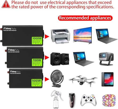 Der 500W Wechselrichter mit reiner Sinuswelle lässt sich einfach über ein Kabel an eine 12V-Batterie anschließen. So hast du jederzeit und überall eine 220V/230V Stromquelle zur Verfügung. Das macht ihn ideal für Stromausfälle, Notfälle, Hurrikane, Urlaube, Autos, Wohnmobile und LKWs. Bei Fragen steht dir ein 24-Stunden-Online-Kundenservice zur Verfügung. Bitte beachte vor der Nutzung die Leistung deiner Elektrogeräte und die korrekte Installationsmethode des Wechselrichters.