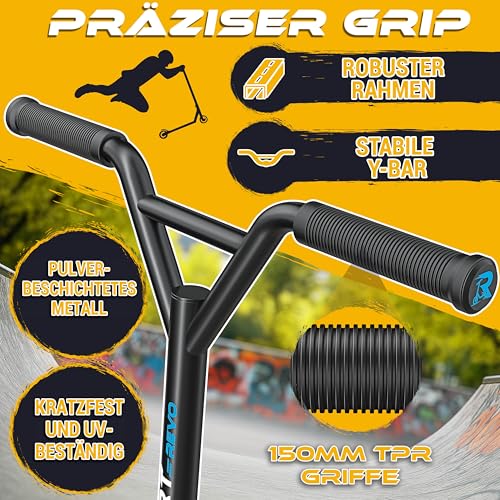 Fragen und Antworten zu RE:SPORT® Stunt Scooter REVO für Kinder & Erwachsene mit Ständer | Profi Stuntroller 100mm PU Wheels & Y-Bar | Stuntscooter Kickscooter ABEC 9 Kugellager | Tretroller Trickroller (REVO Ice Cold)