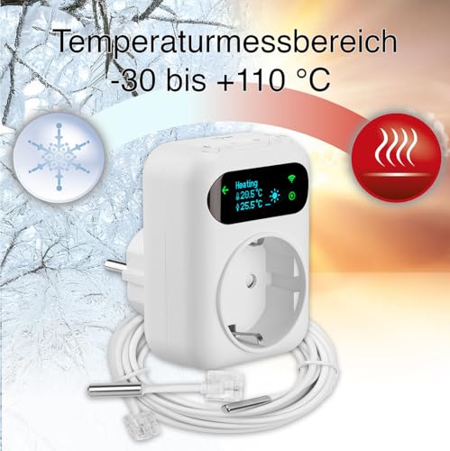 Das Thermostat verfügt über ein farbiges OLED-Display, das dir alle wichtigen Informationen wie Raumtemperatur, Soll-Temperatur, Modus und WLAN-Verbindung anzeigt. Die Bedienung erfolgt intuitiv über vier Tasten. Du kannst individuelle Programme für jeden Tag der Woche erstellen und die Temperatur in 0,5-°C-Schritten einstellen. Im Lieferumfang sind zwei Temperatursensoren mit unterschiedlichen Kabellängen (5 cm und 3 m) enthalten, um die Temperatur optimal zu erfassen. Die Belastbarkeit beträgt bis zu 3.860 Watt (16 A).
