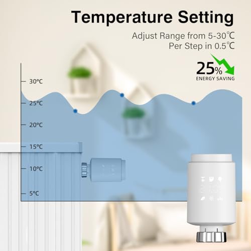 Das smarte Heizkörper-Thermostat Radiatorventil ist eine intelligente Lösung, um deine Heizkörpersteuerung zu optimieren. Es ermöglicht dir, die Temperatur individuell anzupassen und so deinen Wohnkomfort zu erhöhen. Der einstellbare Temperaturbereich liegt zwischen 5 und 30°C, wobei du die Temperatur in Schritten von 0.5°C regulieren kannst. Zusätzlich bietet das Thermostat eine Temperaturkalibrierung von ±5°C, um es optimal an deine Bedürfnisse und die Raumverhältnisse anzupassen. Durchdachte Energiesparfunktionen helfen dir, bis zu 15% Energie zu sparen.