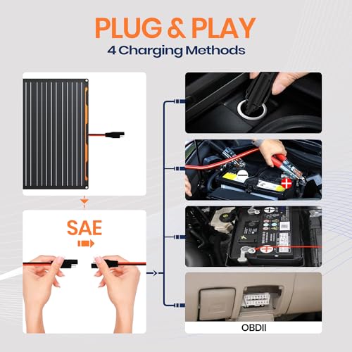 Das Ladegerät bietet eine breite Kompatibilität und ist mit verschiedenen Anschlüssen wie O-Ring, Alligator Clip, Zigarettenanzünder und OBDII ausgestattet. Damit kannst du eine Vielzahl von Geräten und Fahrzeugen aufladen, darunter selten genutzte Fahrzeuge, Boote, Rasenmäher und vieles mehr. Es ist kompatibel mit den meisten Batterietypen, wie z.B. versiegelte Bleisäure-, Lithium-, LiFePO4-, GEL- und AGM-Batterien. Der integrierte Controller sorgt für einen sicheren Lademodus, indem er eine Überladung verhindert und die Ladung automatisch fortsetzt, wenn die Spannung sinkt. Nutze die grüne und kostenlose Solarenergie, um deine Batterien in Schuss zu halten!