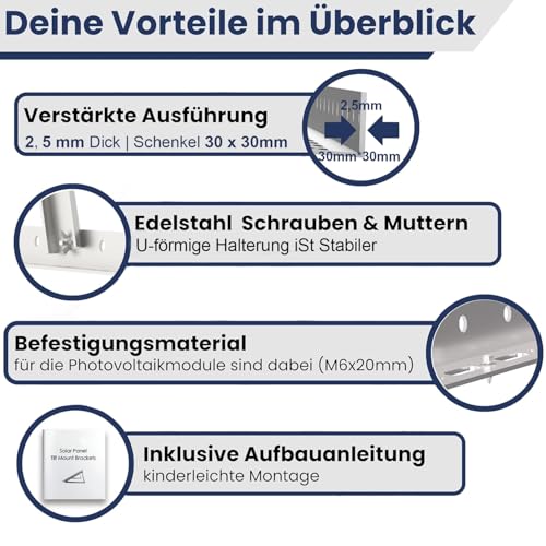 Im Vergleich zu einfachen Montagelösungen bietet diese Solarmodul Halterung eine hohe Flexibilität durch den einstellbaren Neigungswinkel. Andere Produkte verzichten oft auf diese Funktion, was die Optimierung des Energieertrags erschwert. Das verwendete Aluminiummaterial sorgt zudem für eine hohe Stabilität und Langlebigkeit, während einfachere Halterungen oft aus weniger robusten Materialien gefertigt sind. Durch die universellen Einsatzmöglichkeiten ist diese Halterung vielseitiger als viele spezialisierte Produkte.