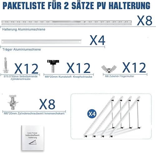 - Der Lieferumfang umfasst Aluminiumschienen, Schrauben und weiteres Montagematerial.