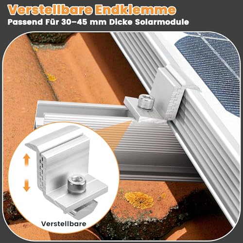 Die Dachhaken bestehen aus robustem Stahl, während die Solarpanel Befestigungen aus hochwertigem Aluminium gefertigt sind. Diese Materialkombination macht die Halterung robust, langlebig, rostfrei und korrosionsbeständig, sodass sie allen Wetterbedingungen standhält. Ein weiterer Vorteil sind die verstellbaren End- und Mittelklemmen. Die Höhe dieser Klemmen kann angepasst werden, um Solarmodule mit einer Dicke von 30 bis 45 mm aufzunehmen. Diese Flexibilität ermöglicht es dir, die Stabilität und den Nutzungseffekt der Halterung optimal zu gewährleisten.