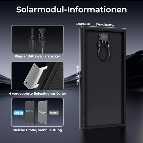 Im Vergleich zu anderen Solarmodulen zeichnet sich dieses Modell durch die Verwendung von monokristallinen Siliziumzellen der Güteklasse A+ aus, die eine höhere Umwandlungsrate bieten. Viele andere Panels nutzen Zellen geringerer Qualität. Der vollständig schwarze Aluminiumrahmen sorgt zudem für eine ansprechende Optik, die sich von herkömmlichen Modulen abhebt. Die einfache Installation, unterstützt durch vormontierte Kabel und vorgebohrte Löcher, ist ein weiterer Vorteil gegenüber manchen Konkurrenzprodukten, die komplexere Montagesysteme erfordern.
