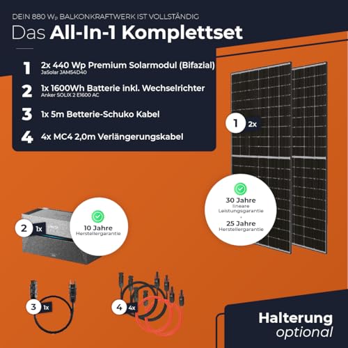 Fragen und Antworten zu Solarway® All In One Balkonkraftwerk mit Speicher 880W komplett Steckdose – 1,6-3,2 kWh Anker Solix 2 AC Speicher – Erweiterungsset für Ihr Balkonkraftwerk (Balkon Halterung, 1,6 kWh Speicher)