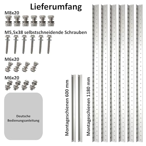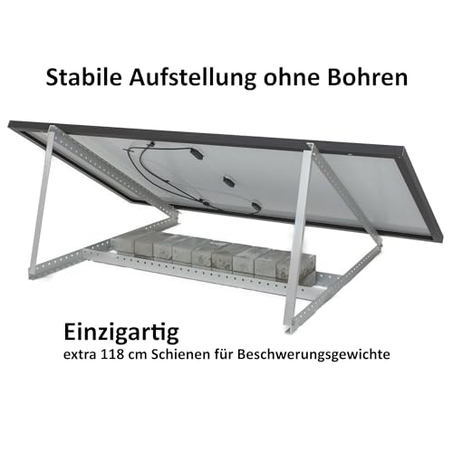 - Die Halterung ist ideal für Module von 400 bis 600 Watt geeignet, dank der 118 cm langen Befestigungsschienen.