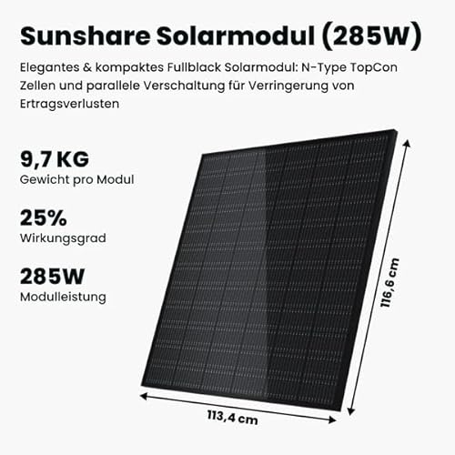 Fragen und Antworten zu SUNSHARE RAY 285W Full Black Solarmodul für Balkonkraftwerk – TopCon N-Typ Zellen mit 25 % Effizienz – Kompaktmodul Komplett Schwarz – Hochleistungs-PV Panel Plug & Play