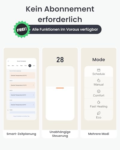 Dank der App-Steuerung kannst du den Thermostat direkt über Bluetooth steuern und eine Vielzahl kostenloser Funktionen nutzen. Dazu gehören intelligente Zeitplanung, Temperaturüberwachung und Fensterstatuserkennung, die dir helfen, noch mehr Energie und Kosten zu sparen. Außerdem sind eine automatische Entkalkung und ein Frostschutz enthalten, um die Sicherheit deines Heizsystems zu gewährleisten. Und keine Sorge um häufiges Batteriewechseln: Laut Produktbeschreibung hält ein einziger Satz Batterien bis zu 10 Monate, also eine ganze Heizperiode. Dank Warnmeldungen bei niedrigem Batteriestand bist du immer vorbereitet. Ein übersichtliches Digitaldisplay zeigt dir Temperatur, Leistungsstufe und Betriebsstatus auf einen Blick.