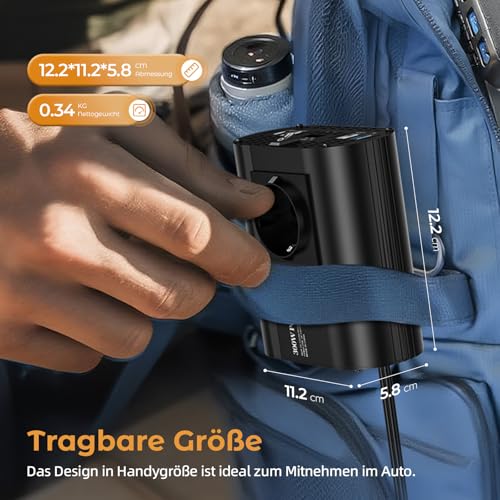 Der TAGEEBLU 300W Wechselrichter verwandelt 12V Gleichstrom in 230V Wechselstrom. Mit seiner hohen Funktionalität bietet er dir die Möglichkeit, bis zu fünf Geräte gleichzeitig zu laden. Dank der verschiedenen Anschlüsse, inklusive USB- und Typ-C-Ports, kannst du flexibel Handys, Laptops und andere Geräte mit Strom versorgen. Der integrierte Sicherheitsschutz sorgt dabei für einen sicheren Betrieb.