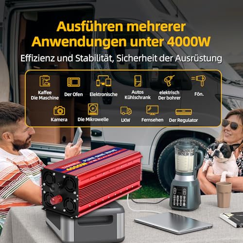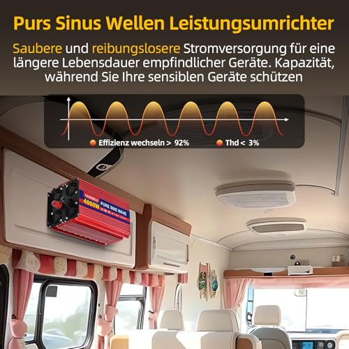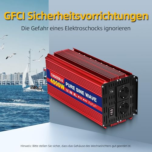 Fragen und Antworten zu TAGEEBLU 4000W Reiner Sinus Wechselrichter DC 12V auf AC 230V Spannungswandler, Wechselrichter für Fahrzeuge mit Alligatorclip, 2 AC Steckdose und LCD Bildschirm