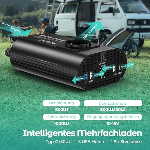 Produktbeschreibung: TAGEEBLU 500W Wechselrichter 12V auf 230V, spannungswandler 12v 230v mit 1 Steckdosen、Type-C 30W、USB-Schnellladung 25W、3 USB-Anschlüsse, LED-Anzeige, Laden von Handys, Laptops und Anderen Geräten