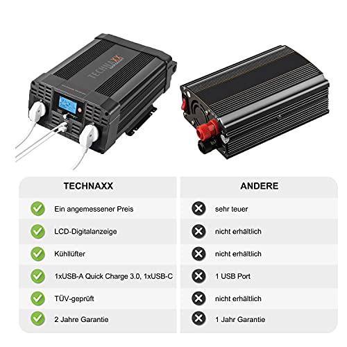 Im Vergleich zu anderen KFZ-Wechselrichtern bietet der Technaxx TE22 den Vorteil eines reinen Sinus, was ihn besonders für empfindliche Geräte auszeichnet. Viele andere Modelle verwenden eine modifizierte Sinuswelle, die zu Problemen bei manchen Geräten führen kann. Auch die integrierten USB-Anschlüsse mit Schnellladefunktion (QC 3.0 und USB-C) sind nicht bei allen Wechselrichtern Standard. Die TÜV-Zertifizierung bietet zusätzliche Sicherheit, die nicht alle Produkte dieser Kategorie aufweisen.