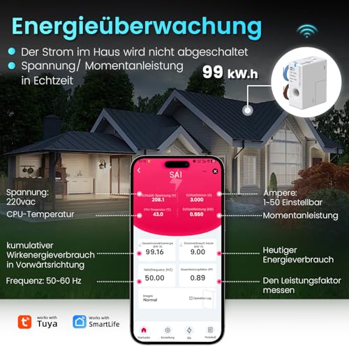 - Echtzeit-Energieverbrauchsmessung über die Smart Life/TUYA App.
