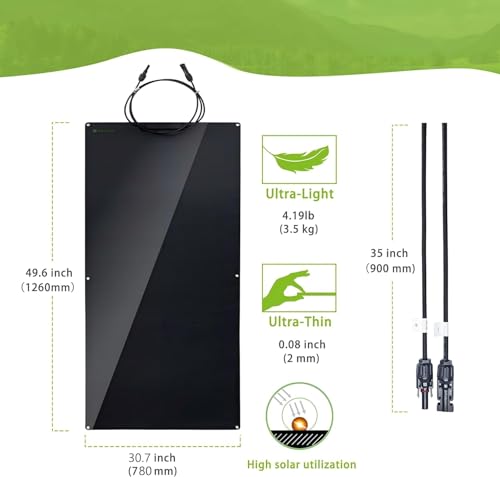 Ein wesentliches Merkmal dieses Solarmoduls ist seine Flexibilität. Es kann auf gekrümmten Oberflächen mit einem minimalen Radius von 40 cm installiert werden. Dies macht es ideal für den Einsatz auf Dächern von Wohnmobilen, Booten, Yachten, Anhängern, LKWs, Autos und anderen unregelmäßigen Oberflächen. Das Solarmodul ist aus hochwertigen Materialien gefertigt, darunter ETFE für eine hohe Lichtdurchlässigkeit und lange Lebensdauer. Die Rückwand besteht aus TPT, das für eine gute Wärmeableitung sorgt und zudem wasserdicht und temperaturbeständig ist.