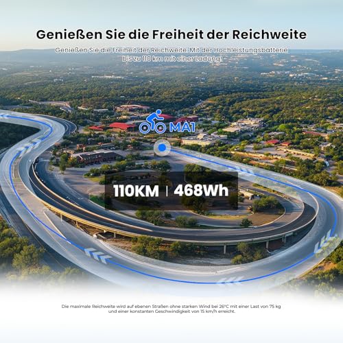 - Reichweite von bis zu 110km im Unterstützungsmodus dank 468Wh Akku