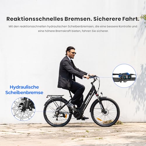Produktbeschreibung: Touroll MA1 26“ E-Bike für Erwachsene, Cityräder Elektrofahrrad mit 250W 75N.M Mittelmotor Motor und 36V 468Wh Akku, Reichweite 110km, Hydraulische Scheibenbremse Ebikes für Herren Damen