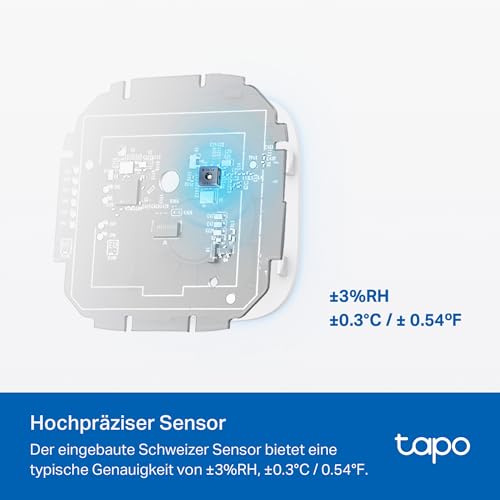 Ein besonderes Merkmal des Tapo T315 ist der hochpräzise Sensor, welcher in der Schweiz hergestellt wird. Dieser Sensor liefert genaue Messwerte mit einer Genauigkeit von ±0,3 ºC und ±3% relativer Luftfeuchtigkeit. Die Daten werden alle 2 Sekunden aktualisiert, sodass du stets aktuelle Informationen erhältst. Beachte jedoch, dass der Bildschirm nur Temperaturen von 0 bis 50 ℃ anzeigt. Sollten die Messwerte außerhalb dieses Bereichs liegen, kannst du die Daten über die Tapo App einsehen.