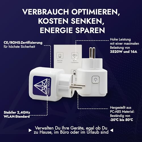 Fragen und Antworten zu Treez Tools Smart Plug 3er Set – WLAN-Steckdose mit App-Steuerung, Energieüberwachung & Fernbedienung, Zeitschaltuhr Steckdose, Stromverbrauchsmesser für Smart Home & Grow, 3520W, 16A, Stromnutzung