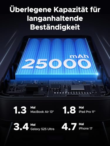 Fragen und Antworten zu UGREEN Nexode Power Bank 145W Max 25000mAh externer Akku mit 3 Anschlüsse USB C Powerbank mit Digitales Display, kompatibel mit MacBook Pro/Air, iPhone 17 Pro Max/Pro/16/15, Galaxy S25 Ultra, Dell