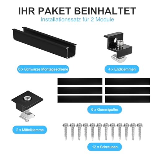 Das Uncle yang Solarmodul Halterung Montageset bietet dir eine zuverlässige Lösung zur Befestigung deiner PV-Module. Mit diesem Schienensystem, bestehend aus 12 cm schwarzen Alu U-Schienen und passenden Klemmen, kannst du deine Solarmodule sicher und stabil installieren. Es ist ideal für Flachdächer, Trapezdächer, Blechdächer und Balkonkraftwerke. Die einfache Montage und die wetterfesten Materialien sorgen für eine langlebige Lösung.