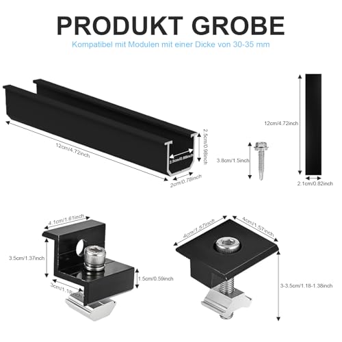 Fragen und Antworten zu Uncle yang Solarmodul Halterung Montageset – 12CM Schwarze Alu U-Schienen + Klemmen für 30-35MM PV Module – Photovoltaik Schienensystem für Flachdach Trapezdach Balkonkraftwerk
