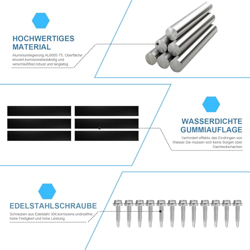 Die einfache Installation ist ein weiterer großer Vorteil dieses Montagesets. Es enthält alle notwendigen Komponenten für eine schnelle und unkomplizierte Montage. Das modulare Design ermöglicht einen reibungslosen Aufbau ohne Spezialwerkzeug, was dir Zeit und Aufwand spart. Darüber hinaus ist die PV-Halterung wetterfest und dauerhaft, da sie UV-beständig, wasserdicht und korrosionsgeschützt ist. Dies gewährleistet einen langfristigen Einsatz auf allen Dachtypen, sodass du deine Solarenergieanlage sorgenfrei nutzen kannst.