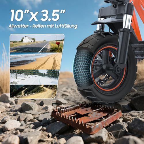 - Der E-Scooter hat 10″ Offroad All-Terrain Reifen.