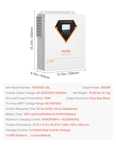 Produktbeschreibung: VEVOR Hybrid-Solarwechselrichter, 3500 W, All-in-One-Wechselrichter mit reinem Sinus, 24 V DC auf 220/230 V AC, mit integriertem 100 A MPPT-Solarregler, für netzunabhängige Blei-Säure-Lithium-Batterie
