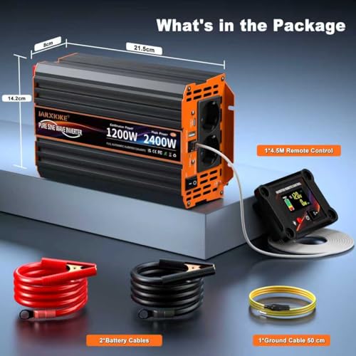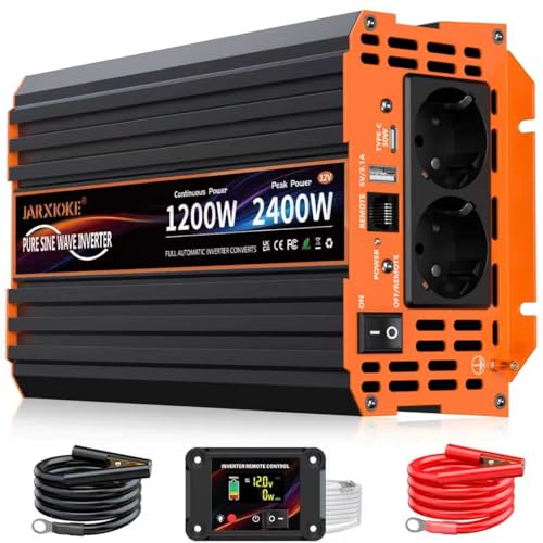 Fragen und Antworten zu Wechselrichter 1200W Reiner Sinus Spannungswandler 12V auf 230V Power Inverter mit LCD Fernbedienung,USB Ports,Type-C Port,2 AC-Steckdosen für Solar,Fahrzeuge,Wohnmobil,Stromausfall,Reise