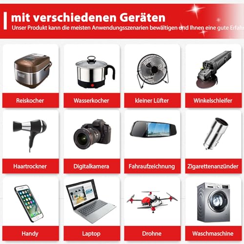 - Du kannst Geräte wie Handys, Laptops, Ventilatoren, Lampen, DVD-Player, GPS-Geräte, Kameras und Elektrowerkzeuge betreiben.