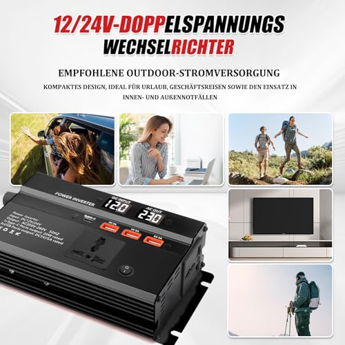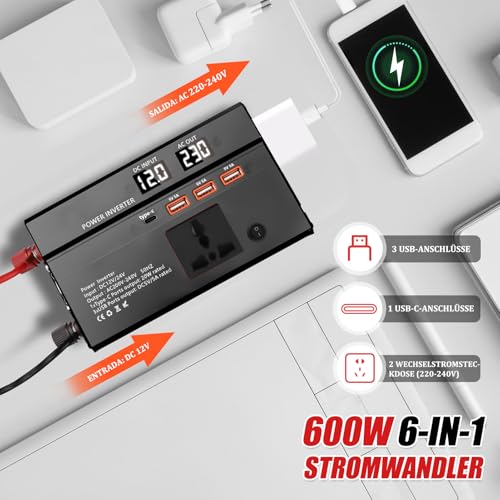 Produktbeschreibung: WODHMIEY 600W Kfz Wechselrichter 12V/24V auf 230V–Auto Spannungswandler mit 2 Steckdose, 3 USB, 1 Type-C, Schnellladung, Dual-LED-Display, für Camping, Reisen, Wohnmobil, LKW & Notfallstromversorgung