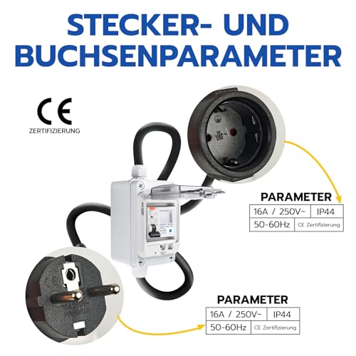 Ein weiteres wichtiges Merkmal ist der integrierte FI Schutzschalter Typ A. Dieser bietet zusätzlichen Schutz vor gefährlichen Fehlerströmen und schaltet im Notfall schnell ab. Das 3 Meter lange Gummikabel sorgt für Flexibilität bei der Positionierung des Zählers. Das IP67 wasserdichte Stromzählergehäuse schützt den Zähler zuverlässig vor Feuchtigkeit und Witterungseinflüssen, was ihn ideal für den Einsatz im Freien macht. Der Schukostecker ist ebenfalls wasserdicht nach IP44.