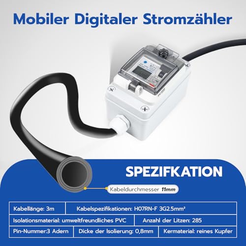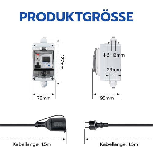 Produktbeschreibung: WSPIHO 230VAC 16A Mobiler Digitaler Stromzähler für Steckdose mit FI Schutzschalter Typ A,230V IP44 Schuko Stecker,Zwischenzähler Strom mit IP67 Stromzählergehäuse