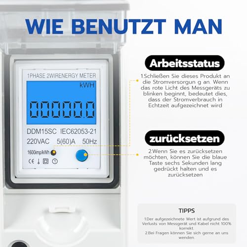 - Digitaler Stromzähler mit LED-Hintergrundbeleuchtung und Ausschaltspeicher.