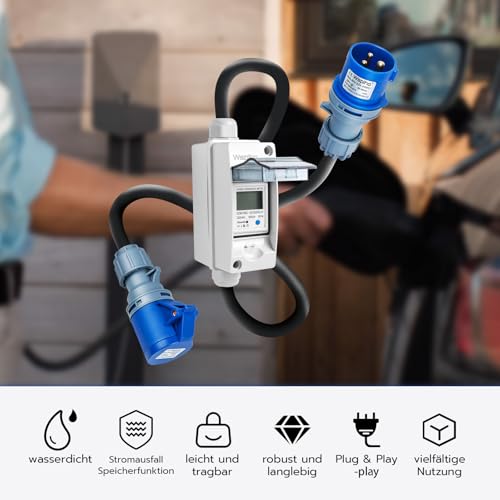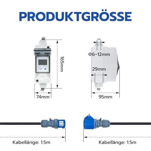 Das IP65-wasserdichte Stromzählergehäuse schützt den Zähler vor Feuchtigkeit und Witterungseinflüssen, sodass du ihn auch im Freien verwenden kannst. Das 3 Meter lange Gummikabel bietet dir ausreichend Flexibilität bei der Platzierung des Zählers. Mit dem CEE 3 Pin 16A Stecker und der CEE 16A Kupplung ist er schnell und einfach an viele gängige Stromanschlüsse anzuschließen. Seine kompakte und tragbare Bauweise macht ihn zu einem idealen Begleiter für unterwegs.