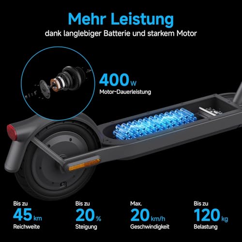 Der E-Scooter verfügt über einen 400 Watt Motor, der es dir ermöglicht, Steigungen von bis zu 20% zu bewältigen. Im Sportmodus profitierst du zudem von einer schnellen Beschleunigung. Du kannst zwischen drei verschiedenen Fahrmodi wählen: Fußgänger-, Standard- und Sportmodus. Für deine Sicherheit im Straßenverkehr ist der E-Scooter mit einer Vorderrad-Trommelbremse, einer Hinterrad-Elektrobremse, Front- & Rückleuchte, Reflektoren und Blinkern ausgestattet. Die IPX5 Schutzklasse bietet Schutz vor Spritzwasser.