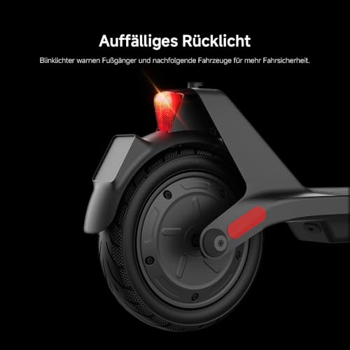 - Die 10 Zoll Reifen mit Notlaufeigenschaften widerstehen dem Luftverlust bei einer Reifenpanne und ermöglichen es, den E-Scooter mit reduzierter Geschwindigkeit weiter zu fahren.
