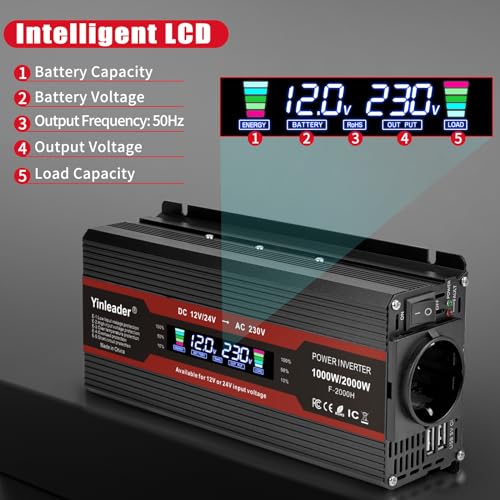 Produktbeschreibung: Yinleader 2000W Wechselrichter 12V/24V auf 230V LCD 1 EU Steckdosen 2 USB Spannungswandler mit Zigarettenanzünder