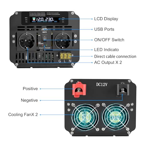 Der Yinleader Wechselrichter ist ein Spannungswandler, der 12V Gleichstrom in 220V/230V Wechselstrom umwandelt. Mit einer Dauerleistung von bis zu 4000W und einer Spitzenleistung von 8000W kannst du eine Vielzahl von Geräten betreiben. Laut Produktbeschreibung verfügt er über eine LCD-Anzeige, auf der du die Spannungs- und Lastbedingungen ablesen kannst. Dies ermöglicht dir, den Zustand deiner Batterie und des Wechselrichters stets im Blick zu behalten. Ein besonderes Merkmal ist die Möglichkeit, das Netzkabel (G/L/N) direkt anzuschließen, was besonders für professionelle Anwender von Vorteil ist, die eine stabile Stromversorgung benötigen.